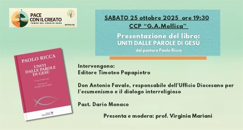 Sabato 25 ottobre alle 19:30, nel CCP “G. A. Mollica”, si terrà la presentazione del libro “Uniti dalle parole di Gesù” del pastore e teologo Paolo Ricca, dedicato al tema dell’unità dei cristiani.