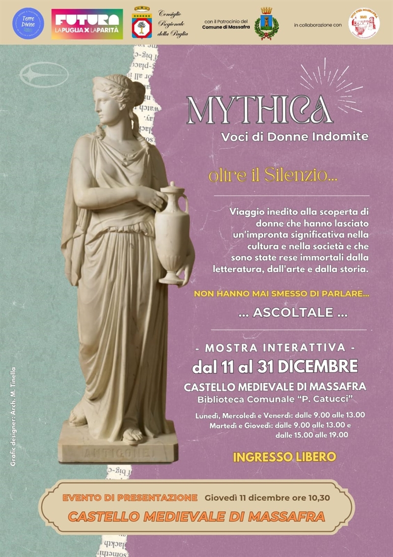 La mostra interattiva "Mythica – Voci di Donne Indomite oltre il silenzio", ideata da Terre Divine aps, sarà presentata giovedì 11 dicembre, alle 10:30, nel Castello medievale di Massafra, nelle sale della biblioteca comunale Paolo Catucci, con l’obiettivo di raccontare figure femminili che hanno lasciato un segno nella cultura, nell’arte e nella storia, restituendo loro voce e memoria.