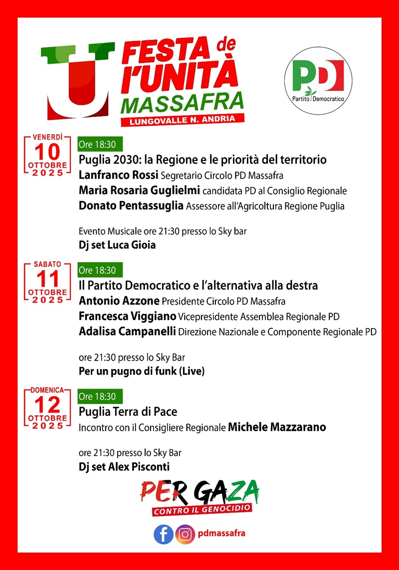 Da venerdì 10 a domenica 12 ottobre, sul Lungovalle Niccolò Andria di Massafra, si terrà l’edizione 2025 della Festa de l’Unità, promossa dal Partito Democratico di Massafra.