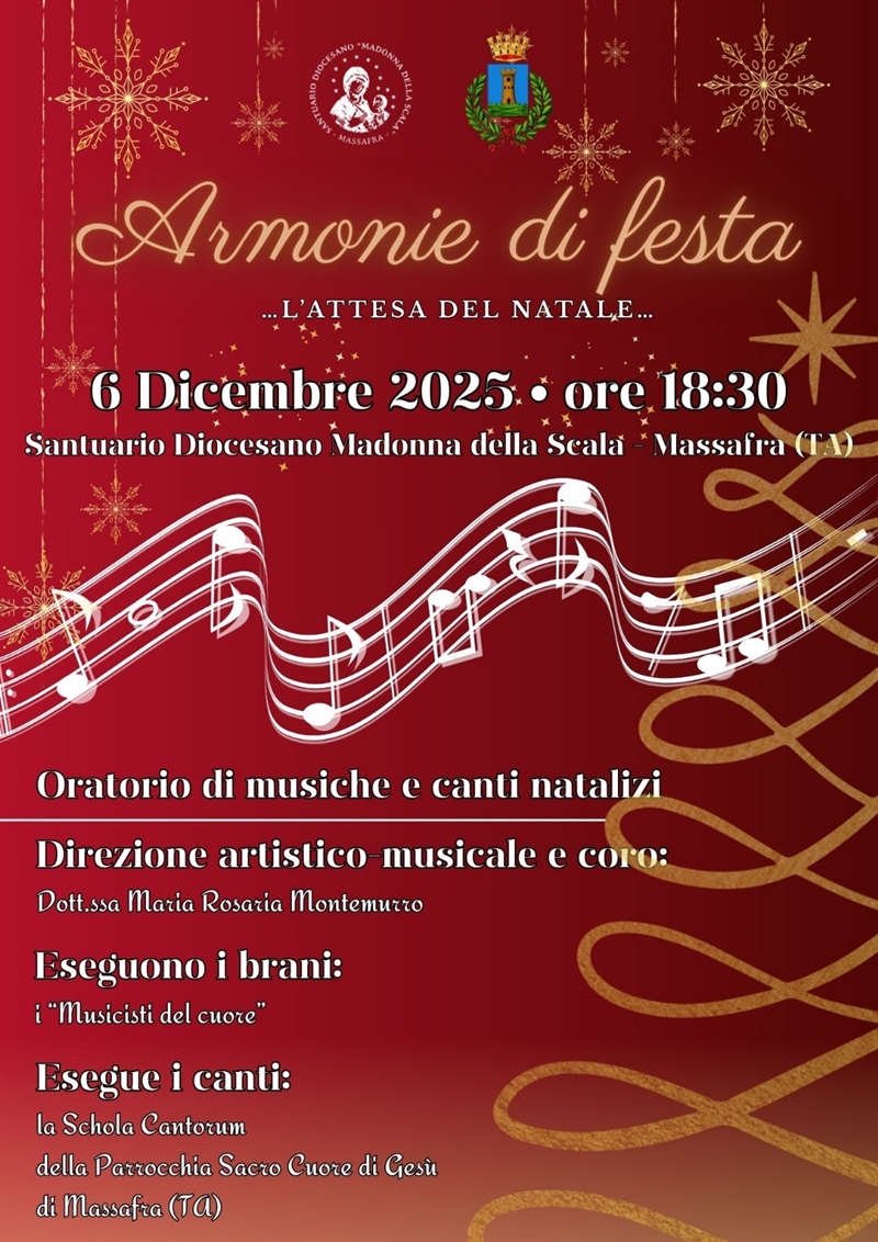 Un oratorio di musiche e canti natalizi, promosso dal santuario diocesano Madonna della Scala con il patrocinio del Comune di Massafra, va in scena oggi, sabato 6 dicembre, alle 18:30, nel santuario diocesano Madonna della Scala di Massafra, con l’obiettivo di accompagnare la comunità nell’attesa del Natale attraverso la musica sacra e il canto corale, affidati a una direzione artistica locale e a formazioni del territorio.
