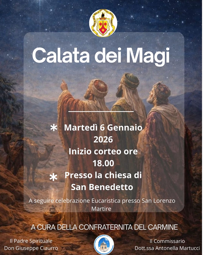 La Confraternita del Carmine organizza a Massafra la "Calata dei Magi", con corteo martedì 6 gennaio con inizio alle 18 alla chiesa di San Benedetto e, a seguire, celebrazione eucaristica nel duomo.
