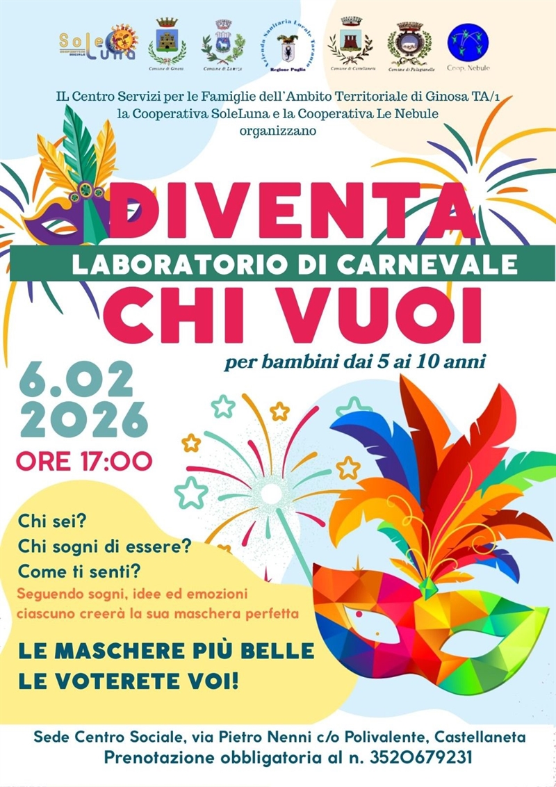 Restando sempre in tema Carnevale, il Comune di Castellaneta promuove il laboratorio «Diventa chi vuoi»: si terrà domani, venerdì 6 febbraio alle 17, nella sede Centro sociale di via Pietro Nenni.