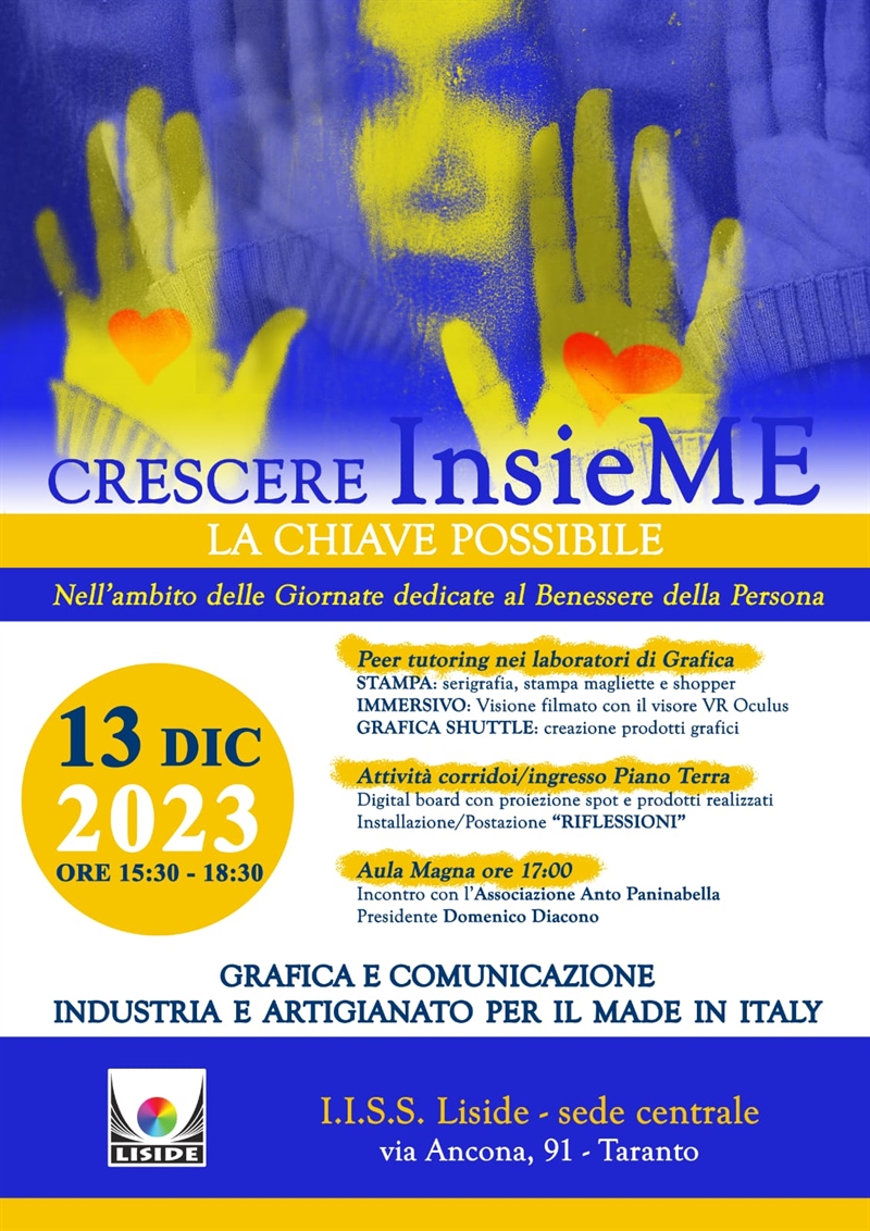 L'istituto di istruzione superiore Liside di Taranto, scuola capofila per la provincia di Taranto della rete delle “Scuole che promuovono la salute”, promossa dagli assessorati alla Salute e all'Istruzione della Regione Puglia e dall'Ufficio scolastico regionale, grazie al coinvolgimento dei docenti del dipartimento di Grafica e all’interesse profuso dal dirigente scolastico Vincenzo Tavella, si apre alla cittadinanza il pomeriggio del prossimo mercoledì 13 dicembre 2023 dalle 15:30 alle ore 18:30.
