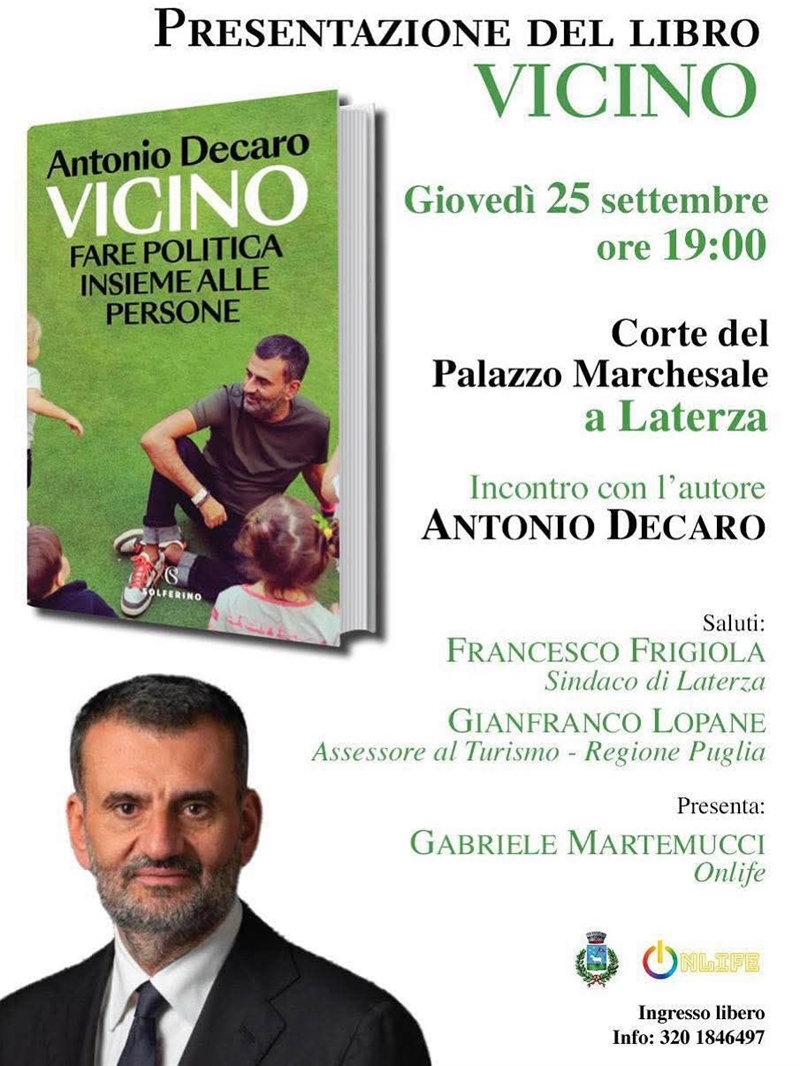 Giovedì 25 settembre, nel suggestivo scenario della Corte del Palazzo Marchesale a Laterza, Antonio Decaro presenterà il suo libro Vicino. Fare politica insieme alle persone (Solferino, 2025) alle 19. Un evento, con ingresso libero, che vede anche la partecipazione di Francesco Frigiola, sindaco di Laterza, e Gianfranco Lopane, assessore al turismo della Regione Puglia; presenterà Gabriele Martemucci per OnLife.