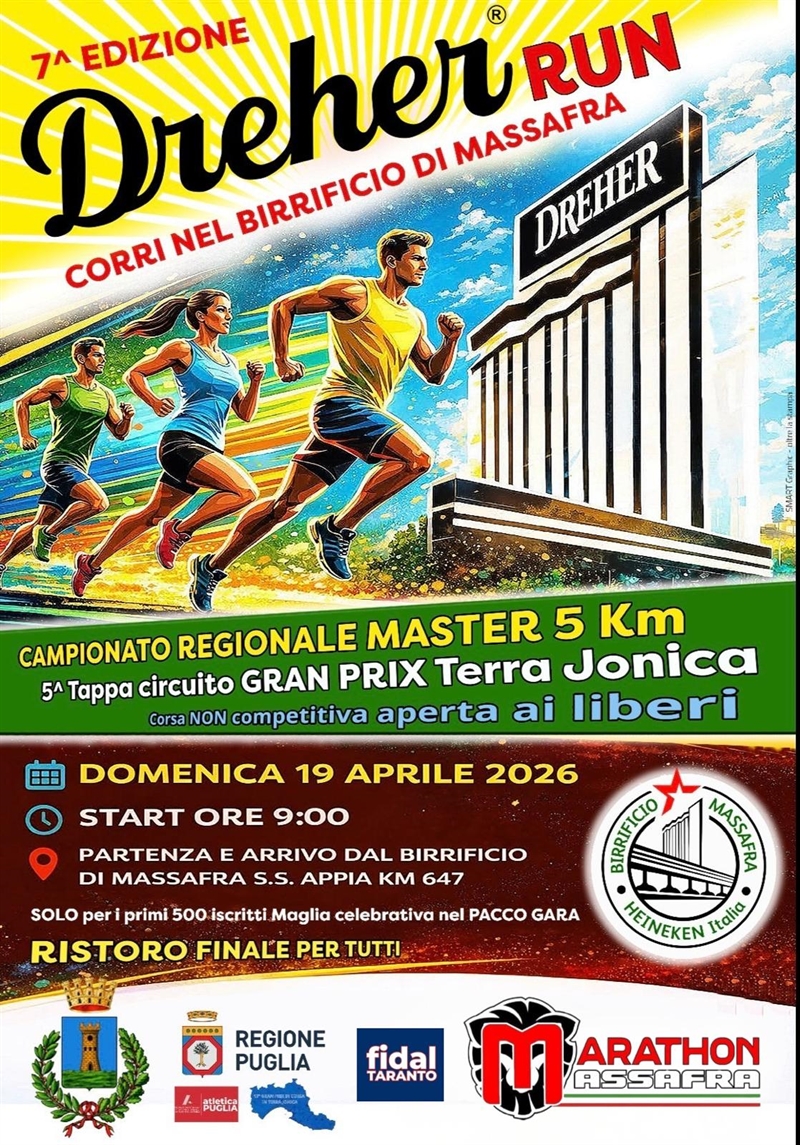 «La Dreher Run non è solo una gara - spiegano dalla dirigenza della Marathon Massafra - ma una festa della città e un'occasione per valorizzare il territorio». L'evento gode dei patrocini del comune di Massafra, della Regione Puglia e della Fidal.