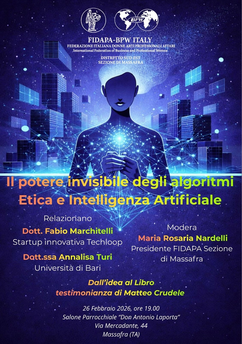 La sezione di Massafra della Fidapa-Bpw Italy organizza per giovedì 26 febbraio un incontro di approfondimento dedicato all'impatto delle nuove tecnologie sulla società.
