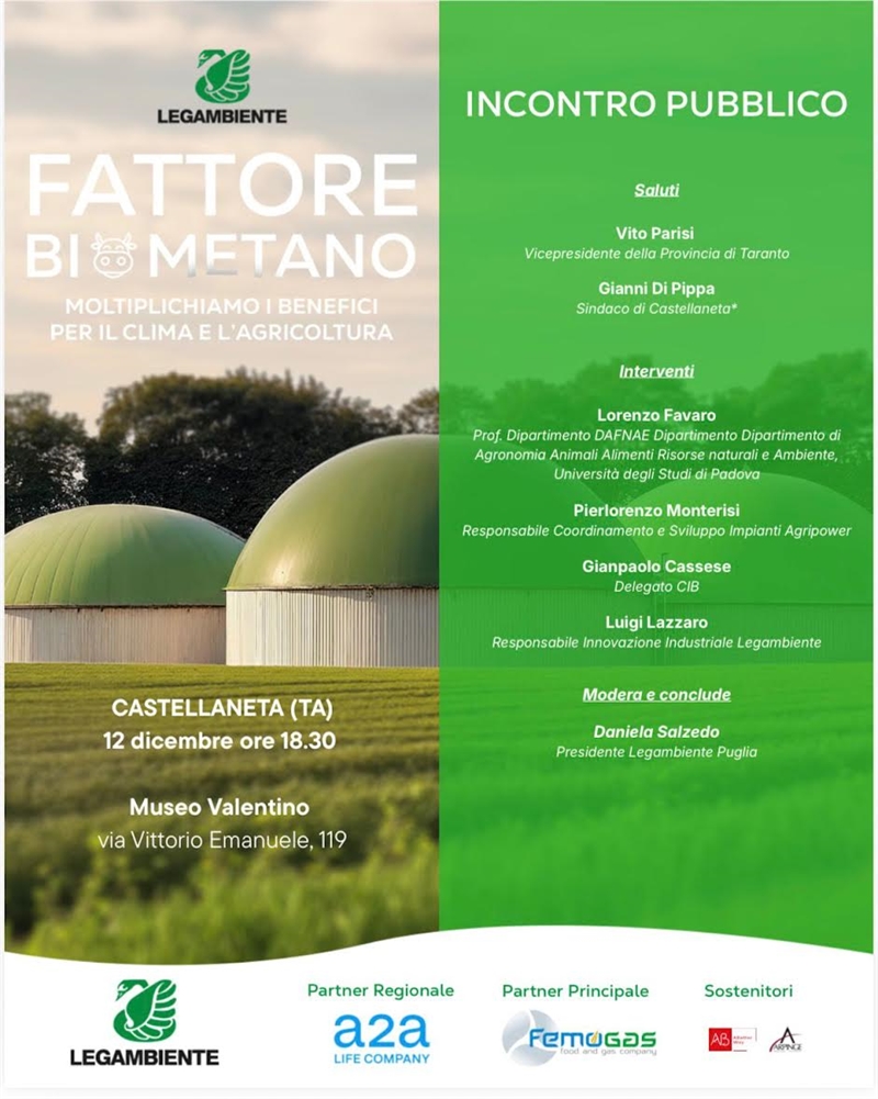 Venerdì 12 dicembre, a partire dalle 18:30 nel Museo Valentino di Castellaneta, si terrà un incontro pubblico rivolto a cittadini, agricoltori, allevatori, amministrazioni pubbliche e studenti per fornire strumenti e informazioni corrette, contrastando le fake news sulla tecnologia della digestione anaerobica della materia organica per la produzione di biogas e biometano.