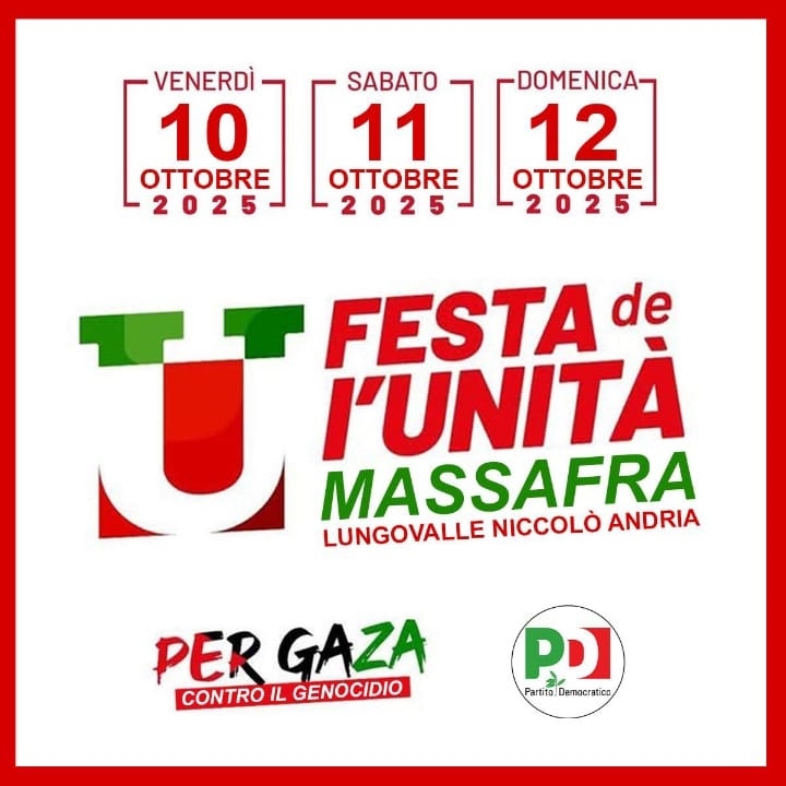 Tre giorni di dibattiti, politica e intrattenimento: è questo il programma della Festa de l’Unità 2025, che torna a Massafra con un calendario dedicato tanto al confronto pubblico quanto alla socialità. L’evento si aprirà venerdì 10 e proseguirà sabato 11 e domenica 12 ottobre, portando nel cuore della città amministratori locali, esponenti politici e semplici cittadini.