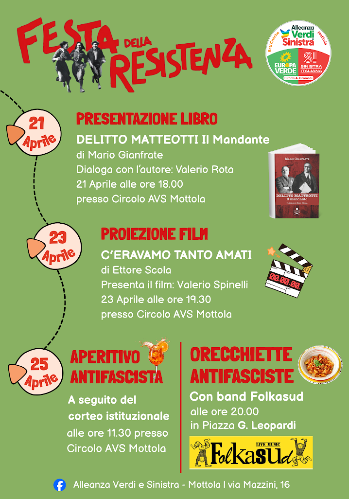 Dalla presentazione di libri alla proiezione di film sui temi dell’antifascismo: «Vogliamo risvegliare la città perché proprio dalla Liberazione nasce la nostra meravigliosa Costituzione antifascista, che negli ultimi 80 anni ci ha garantito democrazia, dignità, pace e sviluppo. Recentemente – ha aggiunto Alleanza Verdi Sinistra - la festa nazionale del 25 aprile è stata celebrata a Mottola solo in sordina, con la partecipazione di poche decine di persone al corteo istituzionale che si snoda per le vie della nostra città. Riteniamo che questo non sia giusto: non possiamo essere pochi a ricordare l’anniversario della Liberazione del Paese dal nazifascismo, l’elemento fondante della costruzione della Repubblica. Del resto – ha concluso il gruppo politico - gli italiani amano molto la democrazia e la Costituzione e l’ultimo referendum costituzionale ne è stato la prova. Pensiamo che anche i mottolesi abbiano il dovere di ricordare degnamente questa data e di esaltare adeguatamente questi valori».