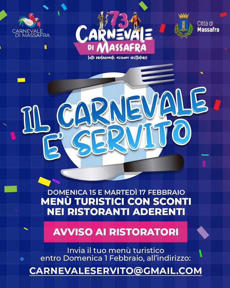 Massafra, domenica 15 e martedì 17 febbraio, i ristoranti aderenti all'iniziativa "Il Carnevale è servito" proporranno menù turistici a prezzi particolari, con l’obiettivo di estendere la festa anche nei locali e coinvolgere la ristorazione nel percorso di crescita legato alla manifestazione.