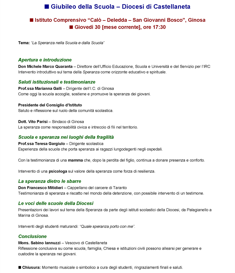 Si terrà giovedì 30 ottobre, alle 17:30, nell’istituto comprensivo statale “G. Calò – G. Deledda – S. G. Bosco” di Ginosa, il Giubileo della Scuola, promosso dalla diocesi di Castellaneta nell’ambito del Giubileo 2025 – Pellegrini di Speranza.