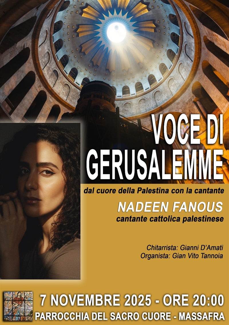 La cantante palestinese Nadeen Fanous si esibirà questa sera alle 20 nella chiesa del Sacro Cuore di Massafra, per portare un messaggio di pace e spiritualità attraverso il concerto Voce di Gerusalemme. L’evento, aperto alla comunità, propone un viaggio musicale dal cuore della Palestina.
