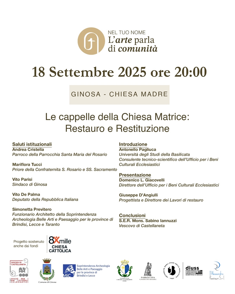 La città di Ginosa ritrova uno dei suoi simboli più importanti. Dopo mesi di lavori, le cappelle della Chiesa Matrice sono state restaurate e verranno ufficialmente riconsegnate alla comunità giovedì 18 settembre alle 20, durante una cerimonia nella Chiesa Madre.