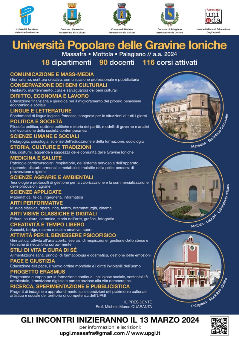 L'Università Popolare delle Gravine Ioniche si conferma quindi come un faro di cultura e formazione nel territorio, offrendo un ventaglio di opportunità che abbracciano diversi ambiti del sapere e dell'esperienza umana.
