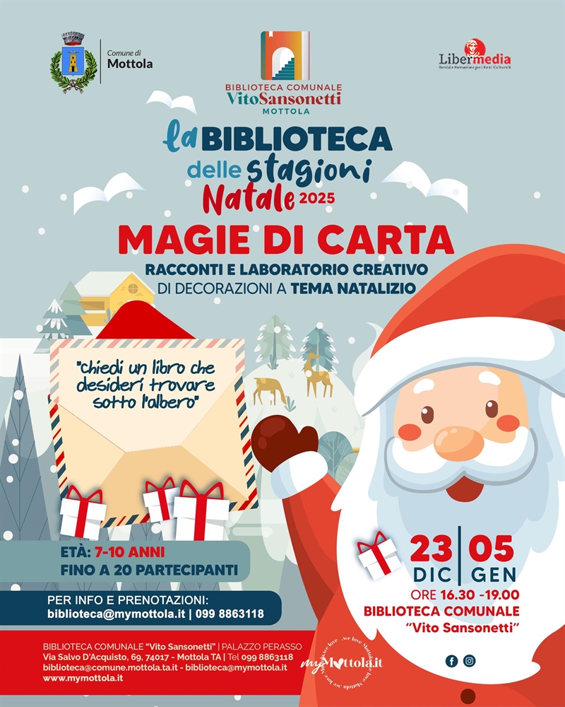 La biblioteca comunale Vito Sansonetti di Mottola, con il Comune di Mottola e Libermedia, propone "Magie di carta", appuntamento natalizio con racconti e laboratorio creativo rivolto ai bambini 7-10 anni, in programma lunedì 5 gennaio dalle 16:30 alle 19 nella biblioteca comunale al palazzo Perasso, in via Salvo D’Acquisto 69, con l’obiettivo di coinvolgere i più piccoli in attività di lettura e creatività.