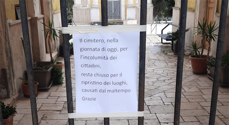 L'allerta meteo arancione per vento forte, diramata dalla protezione civile per tutta la giornata di ieri, non ha risparmiato neanche contrada Zirifico e per questo la regolare apertura del cimitero stamane avrebbe messo a repentaglio l'intera utenza.
