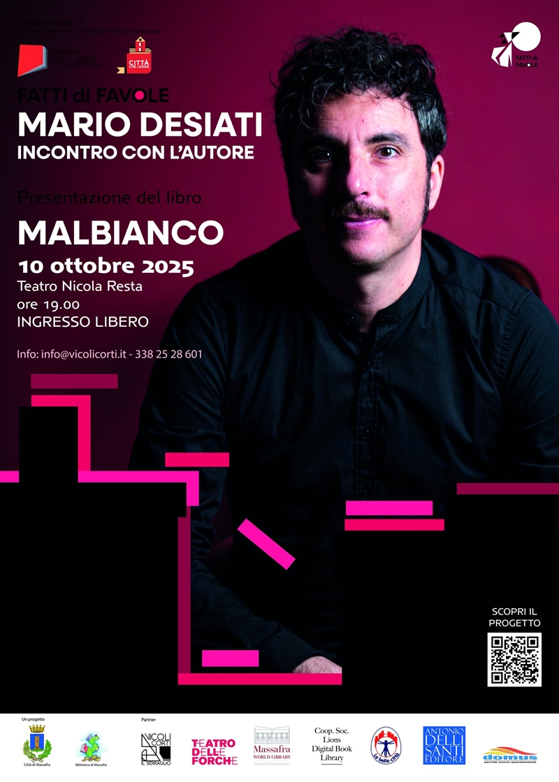 Venerdì 10 ottobre, alle 19, lo scrittore pugliese Mario Desiati, vincitore del Premio Strega 2022, sarà ospite al Teatro comunale Nicola Resta per presentare il suo ultimo romanzo Malbianco, pubblicato lo scorso febbraio da Einaudi. L’incontro, organizzato dall’associazione Il Serraglio, vedrà dialogare con l’autore le bibliotecarie Arianna Gravina e Marica Tarricone. L’ingresso è libero con prenotazione consigliata.