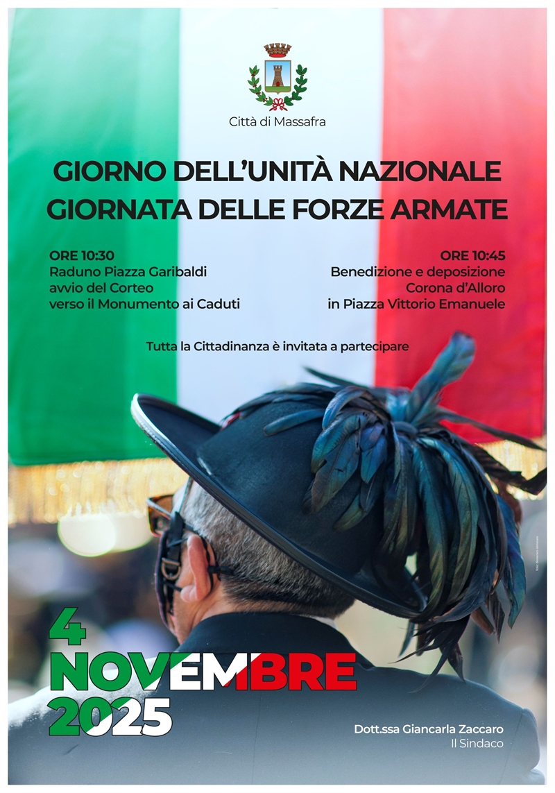 La città di Massafra celebrerà domani, martedì 4 novembre, il Giorno dell’Unità Nazionale e la Giornata delle Forze Armate con una manifestazione pubblica in piazza Garibaldi e piazza Vittorio Emanuele, per rendere omaggio ai caduti e riaffermare i valori di patria, identità e pace.