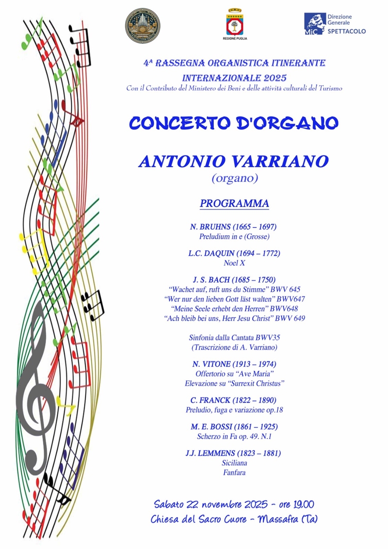 La rassegna, realizzata con il contributo del Ministero dei beni e delle attività culturali e del turismo, propone una serie di appuntamenti in diversi luoghi della regione. A Massafra il protagonista sarà Varriano, organista di lunga esperienza, formato al Conservatorio “L. Perosi” di Campobasso e perfezionatosi in Italia e all’estero sotto la guida di maestri di fama internazionale.