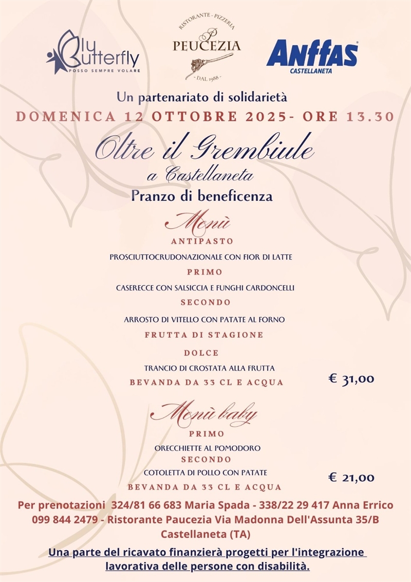 Domenica 12 ottobre, alle 13:30 nel ristorante-pizzeria Peucezia di Castellaneta (piazza dei Popoli), si terrà un evento speciale: un pranzo servito dai ragazzi dell’associazione «Blu Butterfly – Posso Sempre Volare», protagonisti del progetto «Oltre il grembiule».
