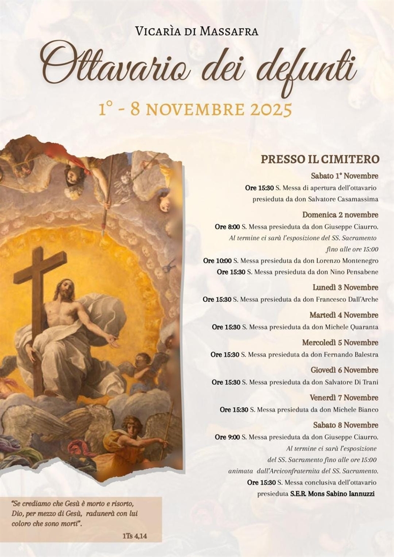 La vicaria invita i fedeli a partecipare numerosi, sottolineando che l’Ottavario è un’occasione per «rafforzare il legame spirituale con i propri cari defunti e affidare a Dio il dono della vita eterna». Il versetto biblico scelto per accompagnare la locandina ricorda: «Se crediamo che Gesù è morto e risorto, Dio, per mezzo di Gesù, radunerà con lui coloro che sono morti» (1Ts 4,14).