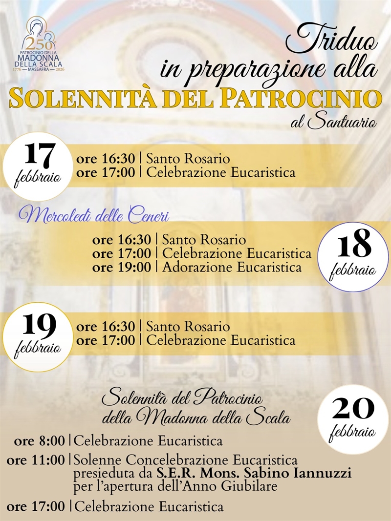 La comunità di Massafra si appresta a celebrare la Solennità del Patrocinio della Madonna della Scala con un programma religioso che culminerà venerdì 20 febbraio alla celebrazione eucaristica delle 11, presieduta dal vescovo Sabino Iannuzzi al santuario diocesano, per dare ufficialmente inizio all'anno giubilare nel 250° anniversario del patrocinio.