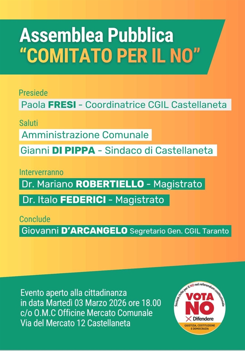 La cittadinanza di Castellaneta è invitata a partecipare a un’assemblea pubblica dedicata all’approfondimento delle ragioni del no in vista del prossimo referendum costituzionale del 22 e 23 marzo. L’appuntamento è fissato per oggi, martedì 3 marzo alle 18, nelle Officine Mercato Comunale.