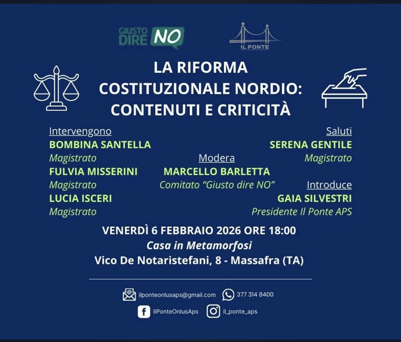 L'associazione "Il Ponte APS" ha promosso per venerdì 6 febbraio alle 18 un dibattito pubblico alla Casa in Metamorfosi in vico De Notaristefani 8 per illustrare alla cittadinanza i contenuti e le criticità della riforma costituzionale Nordio prima del voto popolare. L'iniziativa nasce dalla volontà di analizzare gli aspetti tecnici della nuova legge sulla giustizia attraverso il contributo di esperti del settore, fornendo ai cittadini gli strumenti necessari per affrontare il prossimo appuntamento elettorale.