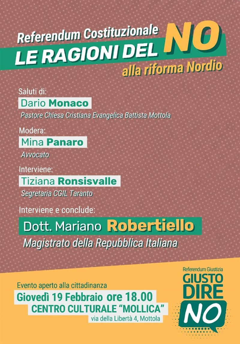 19 febbraio, alle 18, i locali del centro culturale “Mollica” (via della Libertà 4), ospiteranno un incontro pubblico organizzato dal locale comitato per il No per discutere i contenuti e le possibili implicazioni della cosiddetta riforma Nordio sull’assetto democratico del Paese.