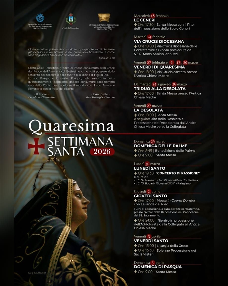 L’Arciconfraternita del Santissimo Sacramento e la parrocchia dell'antica chiesa madre di San Lorenzo Martire di Massafra hanno ufficializzato il calendario delle celebrazioni per la Settimana Santa 2026, che culminerà con la Pasqua di domenica 5 aprile. Il programma, avviato con il rito delle Ceneri, entra nel vivo in questi giorni per accompagnare la comunità cittadina attraverso i momenti centrali della passione, morte e risurrezione di Gesù, coinvolgendo i fedeli in momenti di preghiera corale e solenni processioni nel centro storico.