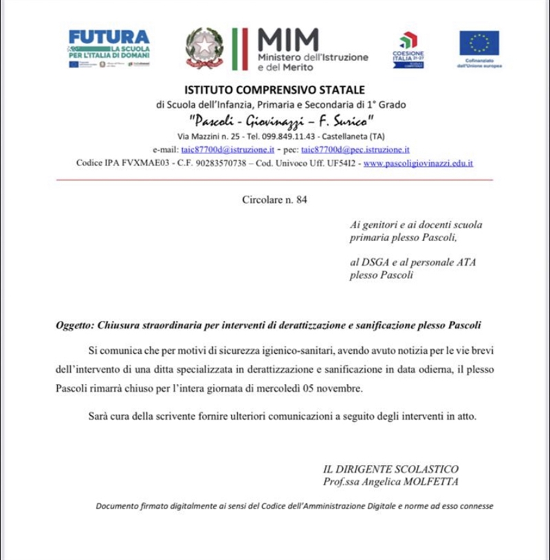 Il plesso Pascoli stamane sarà oggetto di sanificazione e derattizzazione perciò le lezioni sono straordinariamente sospese e rimandate a domani.