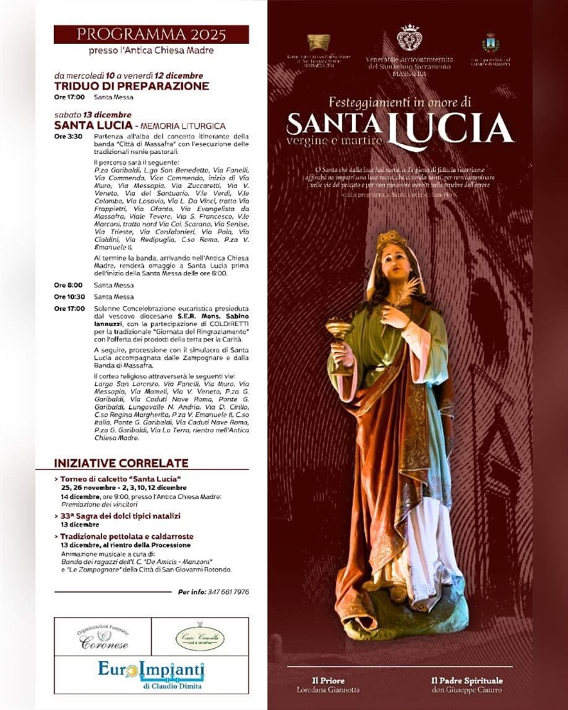 A Massafra, sabato 13 dicembre, nella chiesa Madre, si svolgeranno i festeggiamenti in onore di Santa Lucia, organizzati dalla Venerabile Arciconfraternita del Santissimo Sacramento per rinnovare la devozione popolare attraverso il triduo di preparazione, il corteo musicale, la celebrazione e la processione che attraverserà le vie del centro storico.