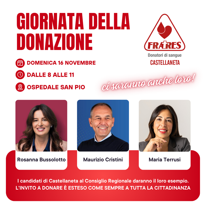 Rosanna Bussolotto, Maurizio Cristini, Maria Terrusi. Doneranno anche i tre castellanetani candidati al consiglio regionale della Puglia nel corso della "Giornata della Donazione" in programma domenica 16 novembre, nel centro di raccolta dell'ospedale "San Pio" di Castellaneta.