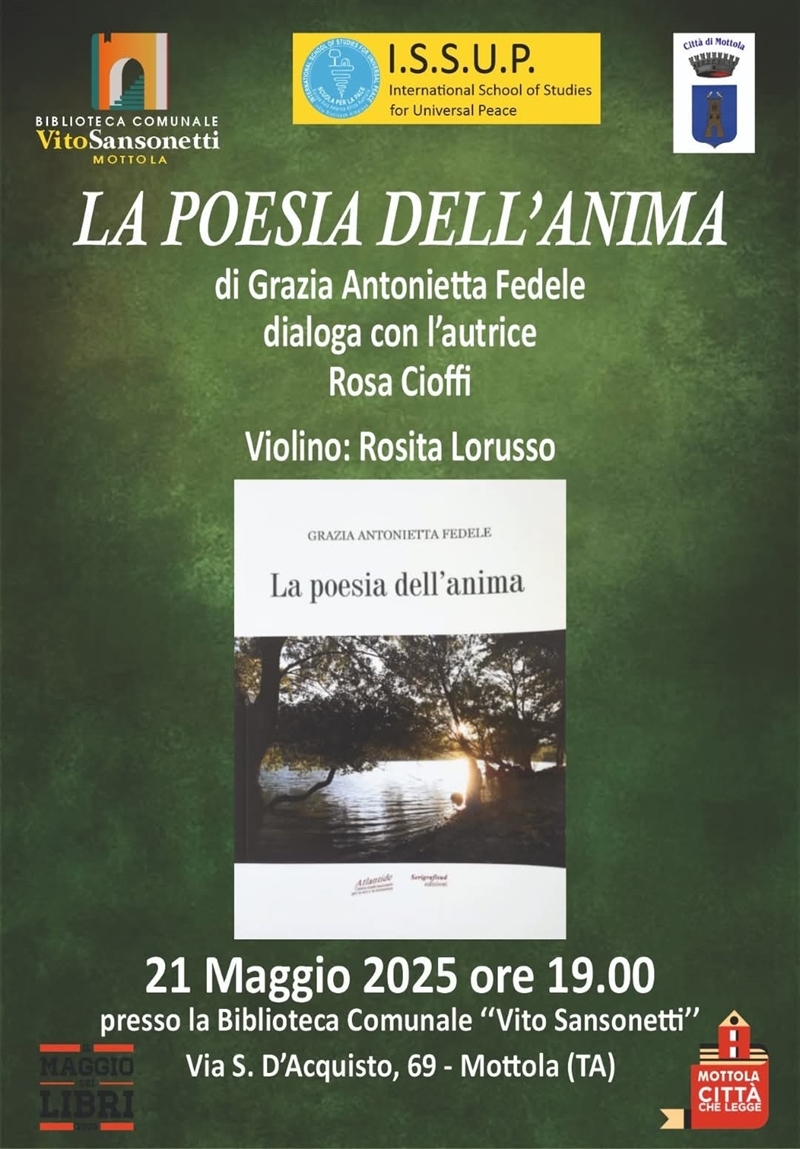 Mercoledì 21 maggio alle 19, nella biblioteca comunale Vito Sansonetti di Mottola, si terrà la presentazione del libro "La poesia dell’anima" dell'autrice massafrese Grazia Antonietta Fedele, evento inserito nel cartellone del Maggio dei Libri e promosso dall’associazione ISSUP – International School of Studies for Universal Peace, con il patrocinio del Comune di Mottola.