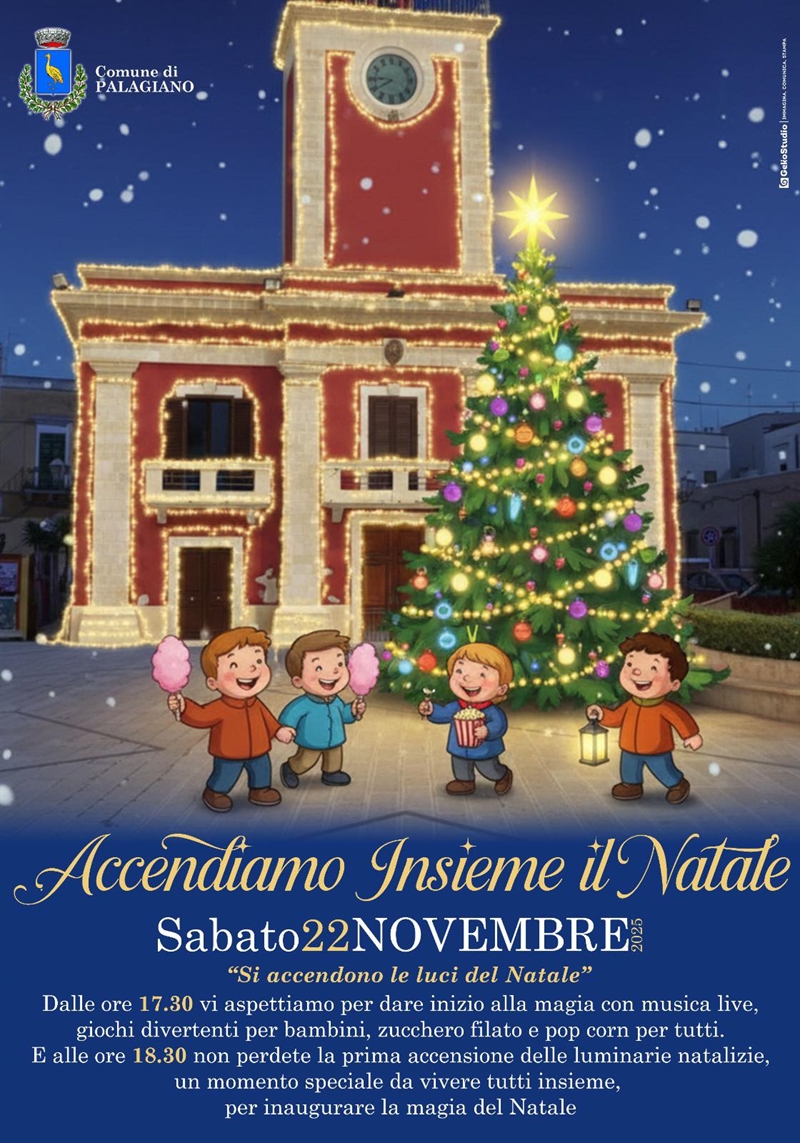 A Palagiano, la comunità si prepara a inaugurare il periodo natalizio con un evento condiviso: sabato 22 novembre, in piazza Vittorio Veneto, si terrà la prima accensione delle luminarie, un appuntamento voluto dal Comune per dare avvio alle festività con un momento di partecipazione collettiva. L’iniziativa è stata organizzata per offrire alla cittadinanza un’occasione di festa e per creare un clima di condivisione e serenità in vista del Natale.