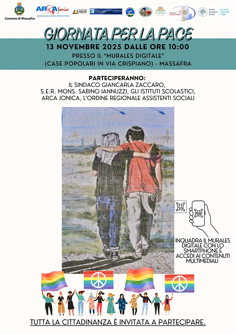 Giovedì 13 novembre, dalle 10, nel piazzale antistante il murales digitale di via Crispiano, il Comune di Massafra organizza la Giornata per la pace.