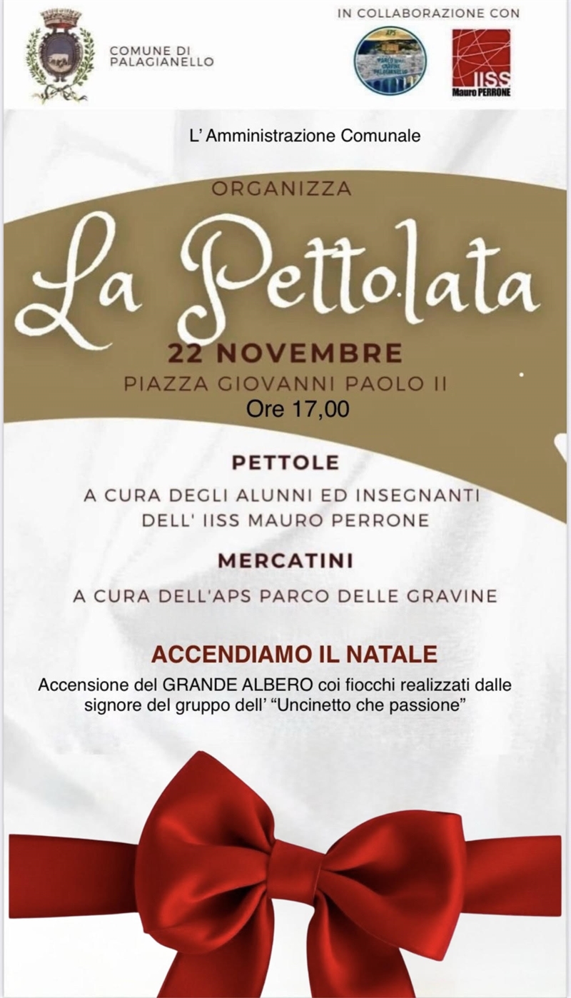 Palagianello inaugura le festività natalizie con la tradizionale "Pettolata di Santa Cecilia": con questo evento, l'amministrazione comunale dà ufficialmente il via al calendario delle manifestazioni natalizie, puntando a unire la comunità tra luci, sapori e la riscoperta delle tradizioni.