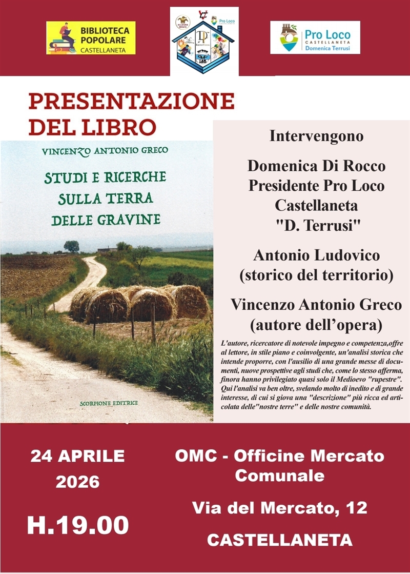 L'appuntamento editoriale è fissato per le 19 nel salone delle Officine Mercato Comunale, situate in via del Mercato 12. L’evento, organizzato con il contributo della Biblioteca Popolare Castellaneta e della Pro Loco locale, si propone di approfondire le peculiarità storiche e paesaggistiche di un’area geografica di particolare pregio.