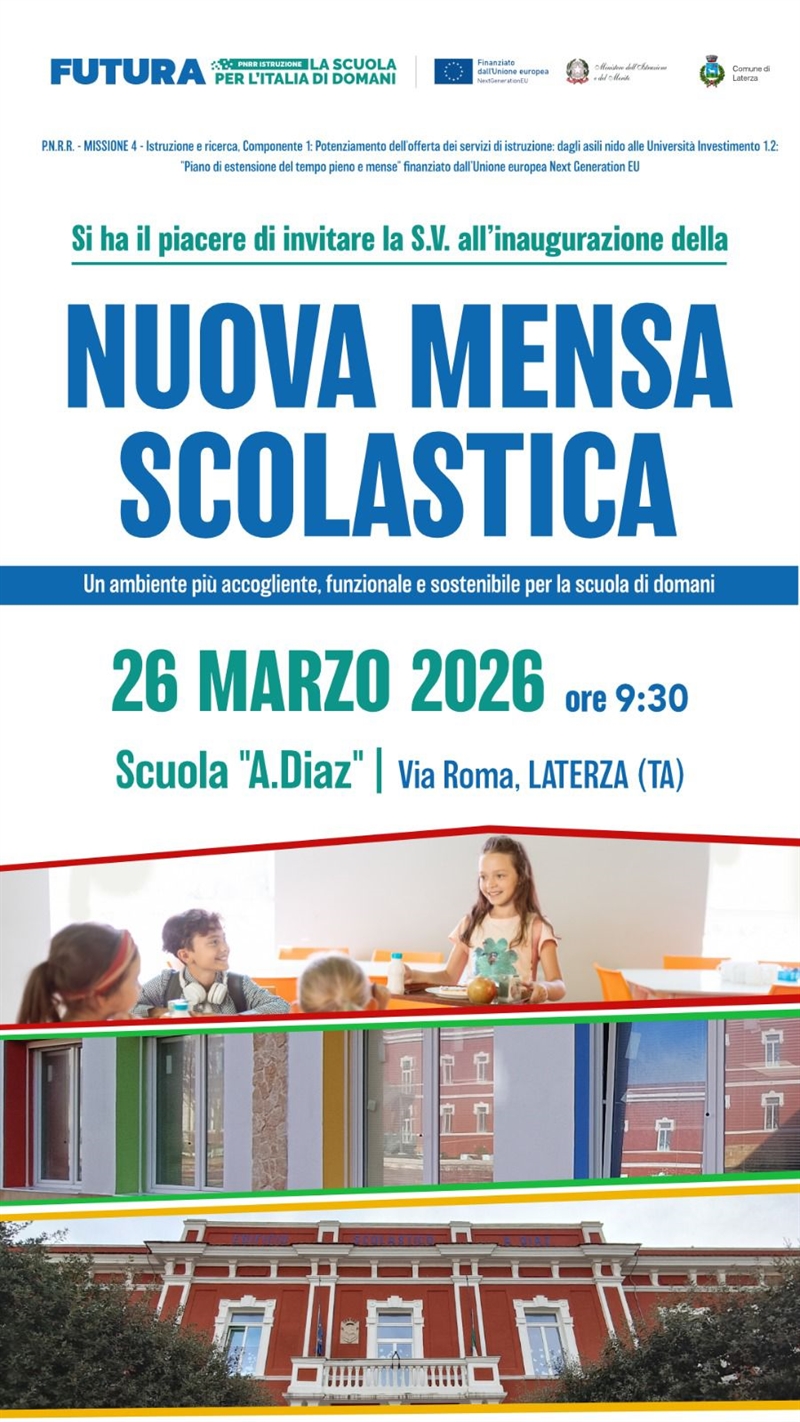 Si terrà giovedì 26 marzo, alle 9:30 del mattino, l'inaugurazione ufficiale della nuova mensa scolastica della scuola Diaz di via Roma, a Laterza.