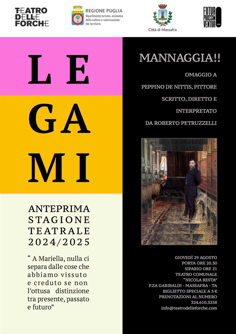Un monologo, per incontrare il pittore Giuseppe De Nittis, grande interprete dell’impressionismo in Italia. De Nittis, nato a Barletta nel 1846 e morto a soli 38 anni, visse e lavorò a Napoli, Londra e Parigi, scoprendo nell’ultimo periodo della sua vita che a breve avrebbe perso la vista. L’interpretazione, che tenta di immaginare come il pittore De Nittis visse questo dramma, svela un artista che ha raccontato la vita attraverso i colori delle sue tele, gli stessi colori di cui ha fissato non solo la luce ma anche l’anima, quando ormai la vista si annebbiava sempre più.