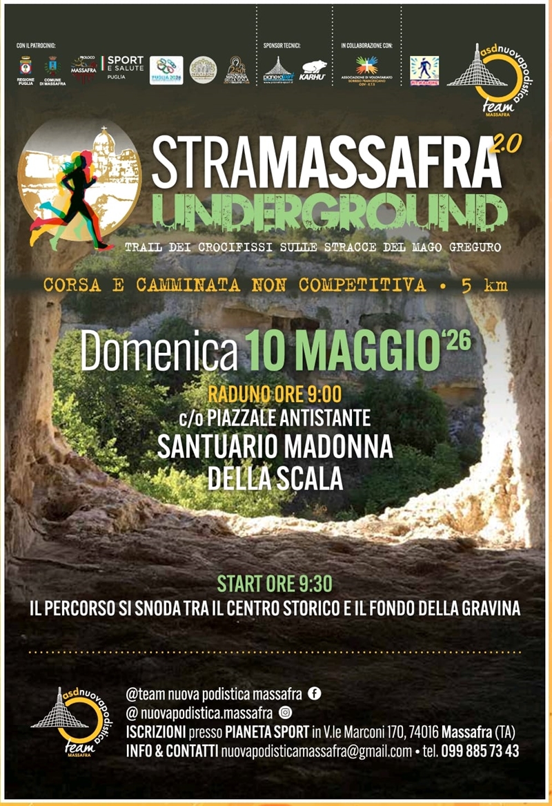 L'associazione Asd Nuova Podistica Team Massafra, in collaborazione con la Deputazione Feste Patronali, organizza per domenica 10 maggio la manifestazione sportiva non competitiva denominata «Stramassafra Underground 2.0».