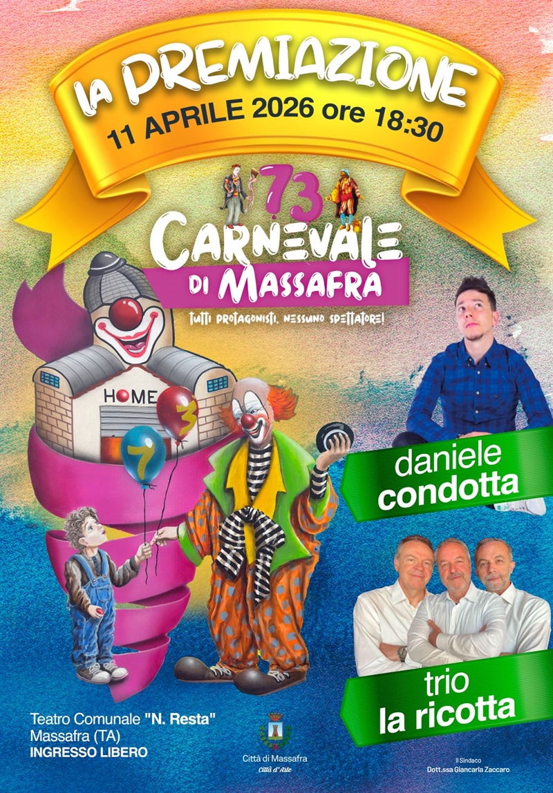 Il sindaco Giancarla Zaccaro premierà domani, sabato 11 aprile alle 18:30, i vincitori della 73^ edizione del Carnevale di Massafra nella cerimonia ufficiale organizzata al teatro comunale Nicola Resta.