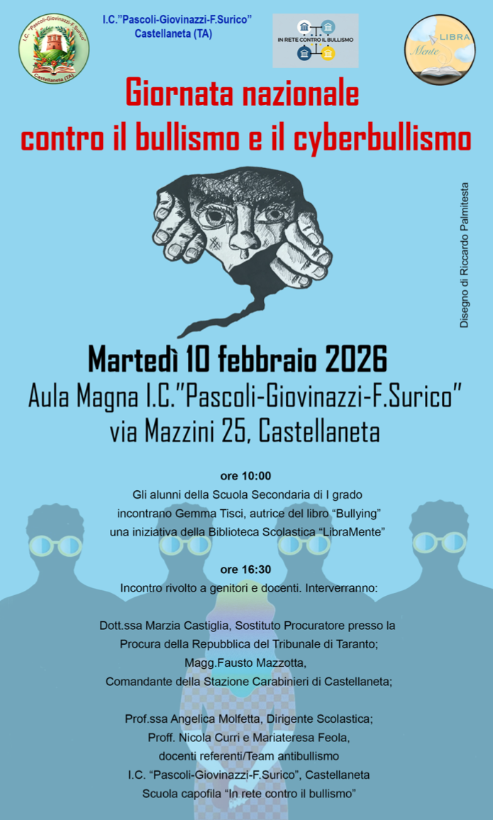 L'istituto comprensivo "Pascoli-Giovinazzi-F.Surico" di Castellaneta ospiterà martedì 10 febbraio una giornata dedicata al contrasto del bullismo e del cyberbullismo, articolata in due momenti di approfondimento rivolti rispettivamente agli studenti e alla cittadinanza.