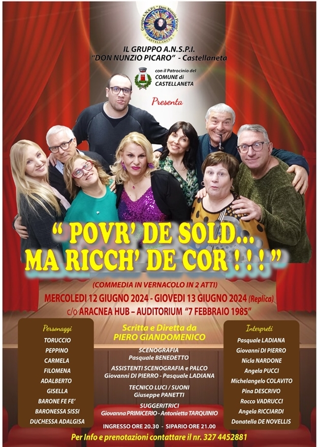 Mercoledì 12 giugno e in replica giovedì 13, con ingresso alle 20:30, a calcare il palcoscenico di via Monsignor Potenza saranno i protagonisti del gruppo Anspi "Don Nunzio Picaro" con "Pov'r de sold...ma ricch' de cor".