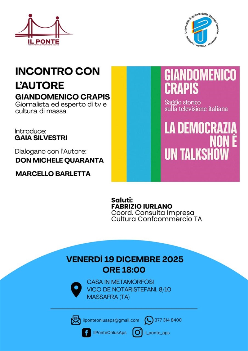 Venerdì 19 dicembre, alla Casa in Metamorfosi di Massafra, è in programma un incontro con l’autore Giandomenico Crapis, giornalista ed esperto di televisione e cultura di massa, dedicato al suo saggio «La democrazia non è un talkshow», per riflettere sul rapporto tra informazione televisiva e vita democratica.