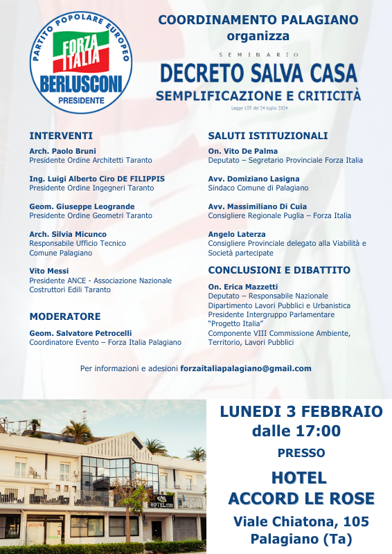Si parlerà di Decreto salva casa, semplificazione e criticità nel corso del seminario organizzato dal coordinamento palagianese di Forza Italia.