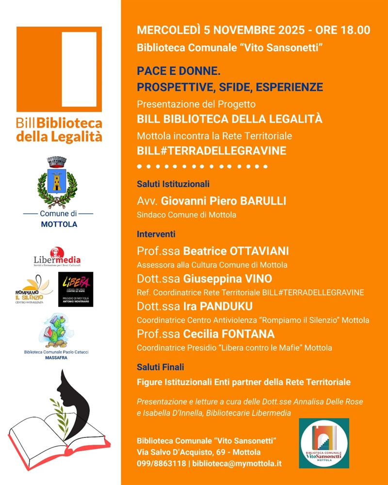 Si terrà oggi, mercoledì 5 novembre, alle 18, nella biblioteca comunale “Vito Sansonetti” di Mottola l’incontro dal titolo “Pace e donne. Prospettive, sfide, esperienze”, organizzato dal Comune di Mottola in collaborazione con LiberMedia e la Rete territoriale Bill#TerradelleGravine.