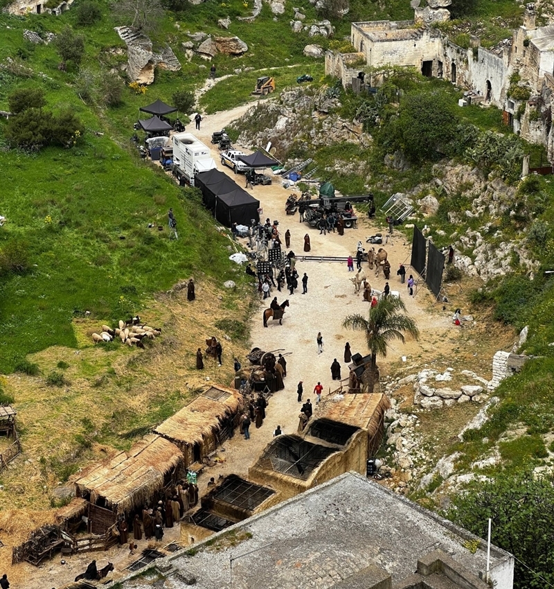 Nella gravina, decine di professionisti tra attori, comparse e maestranze agli ordini del regista, sono impegnati nella lavorazione del film. Per l’occasione è stato allestito un vero e proprio villaggio d’epoca, ricostruito nel dettaglio per assecondare le esigenze scenografiche, che trasforma temporaneamente l’area in un set cinematografico di grande impatto.