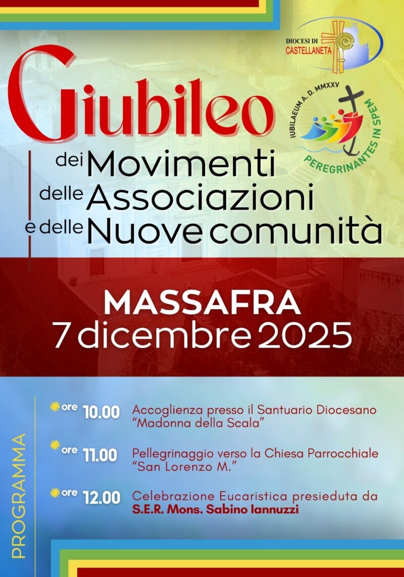 A Massafra, domenica 7 dicembre, si svolgerà il Giubileo dei movimenti, delle associazioni e delle nuove comunità, organizzato dalla diocesi di Castellaneta per riunire gruppi ecclesiali e fedeli in un percorso di preghiera e comunione, articolato tra il santuario di Madonna della Scala e il duomo, con momenti di accoglienza, pellegrinaggio e celebrazione eucaristica.