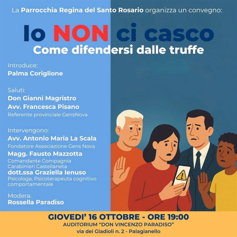 «Io non ci casco» è il titolo dell'evento organizzato dalla parrocchia Regina del Santo Rosario di Palagianello, in programma giovedì 16 ottobre nell'auditorium Don Vincenzo Paradiso.